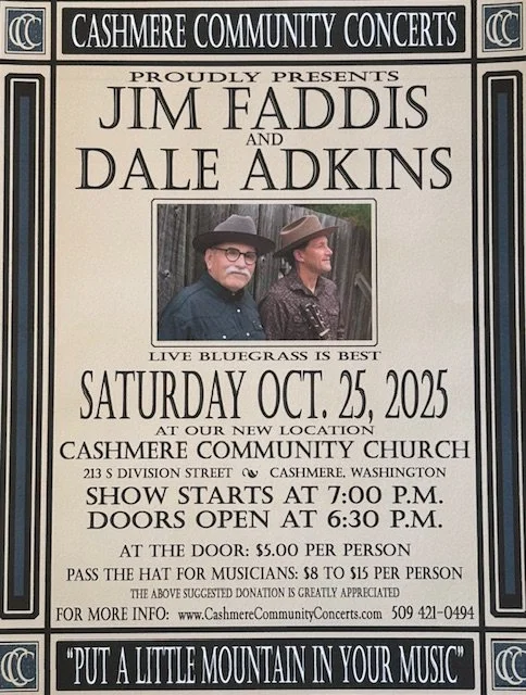 Back to All Events Cashmere Community Concerts Proudly Presents: Jim Faddis and Dale Adkins Saturday, October 25, 2025 6:30 PM 9:00 PM Cashmere Community Church 213 South Division Street Cashmere, WA, 98815 United States (map) Google Calendar ICS